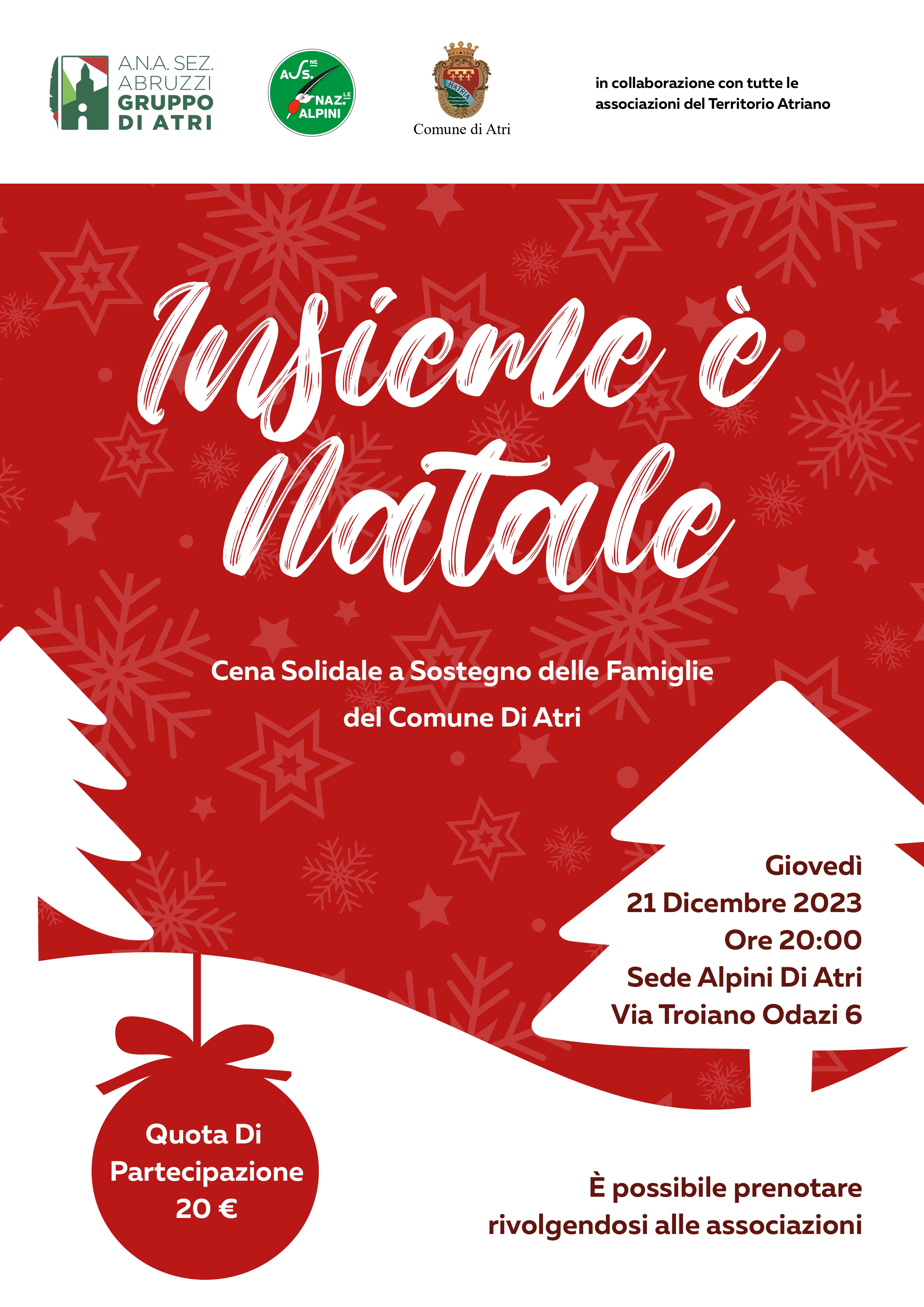 Per il secondo anno la nostra associazione in collaborazione con il comune di Atri e con le associazione sul territorio Atriano, organizza la cena di solidarietà "Insieme é Natale" a sostegno delle famiglie Atriane.